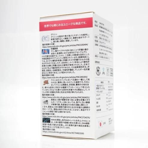 成份: 豬肝萃取物(日本產)、 甘氨酸、薑黃提取物、 微晶纖維素、含鋅酵母、麥芽糖醇、硬脂酸鈣、微細二氧化矽、β-NMN
